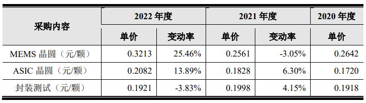 2020年度與2021年度,公司的原材料平均采購單價較為穩(wěn)定。2022年度晶圓采購單價漲幅較大,主要原因系上游代工在產(chǎn)能緊張背景下提高了供貨價格,以及當年度單價較高的ASIC晶圓采購占比提高所致。另外,公司MEMS晶圓代工廠主要為臺積電和VIS,上述兩家代工廠均采用美元結(jié)算;2022年度,由于美元對人民幣匯率持續(xù)走高,一定程度上拉高了當年度晶圓采購單價。