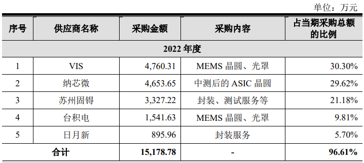 招股書也展示了明皜傳感目前的主要供應商情況: