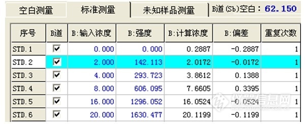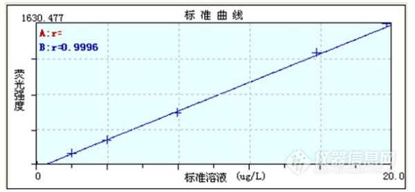 標(biāo)準(zhǔn)曲線繪制,取1000μg/mL銻標(biāo)液稀釋成1000ng/mL的標(biāo)準(zhǔn)工作液,分別吸取0mL,0.2mL,0.4mL,0.8mL,1.6mL和2.0mL銻標(biāo)準(zhǔn)工作液,置于100mL容量瓶中,加入5mL鹽酸加入10mL硫脲溶液(100g/L),室溫放置30min,混勻,用去離子水定容,配置成0ng/mL,2ng/mL,4ng/mL,8ng/mL,16ng/mL和20ng/mL的標(biāo)準(zhǔn)系列溶液。繪制熒光強度-濃度標(biāo)準(zhǔn)曲線。