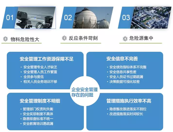 隨著社會對企業安全生產和環境保護的重視程度日益提高,安全、環保已成為化工企業的核心競爭力。對此,從國家層面到地方政府制定了一系列安全、環保管理的法律法規,企業也相應制定了一系列管理制度,以確保安全、環保管理的合法合規。然而,仍然存在大量違章指揮、違章操作、違反勞動紀律的現象發生,從而導致嚴重事故的發生。在安全、環保管理過程中亟需一個標準化的解決方案推動制度的執行及效果跟蹤,確保安全、環保管理措施的落地,為企業“零事故、零傷亡”目標的實現保駕護航。