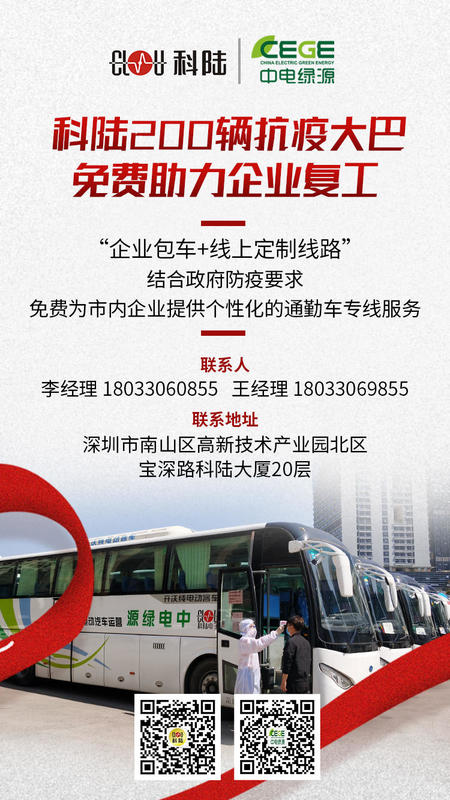 深圳市中電綠源純電動汽車運營有限公司是擁有600輛純電動大巴的專業運營公司,首批調配出車況最好的200輛大巴,采用“企業包車+線上定制線路”的方式,結合政府防疫要求,免費為市內企業提供個性化的通勤車專線服務,減少企業員工乘坐公共交通工具的交叉感染風險。