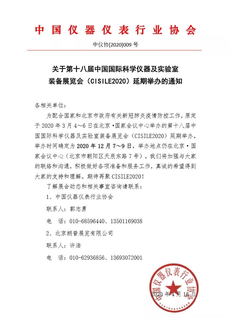 為配合國家和北京市政府有關新冠肺炎疫情防控工作,原定于 2020 3 46 日在北京·國家會議中心舉辦的第十八屆中國國際科學儀器及實驗室裝備展覽會(CISILE2020)延期舉辦,舉辦時間確定為 2020 12 79 日,舉辦地點仍在北京·國家會議中心(北京市朝陽區天辰東路 7 號)。我們將加強與大家的聯絡和溝通,積極做好各項準備和服務工作,真誠的希望得到大家的支持和理解。期待再聚 CISILE2020