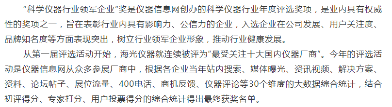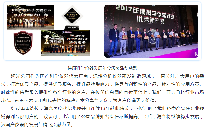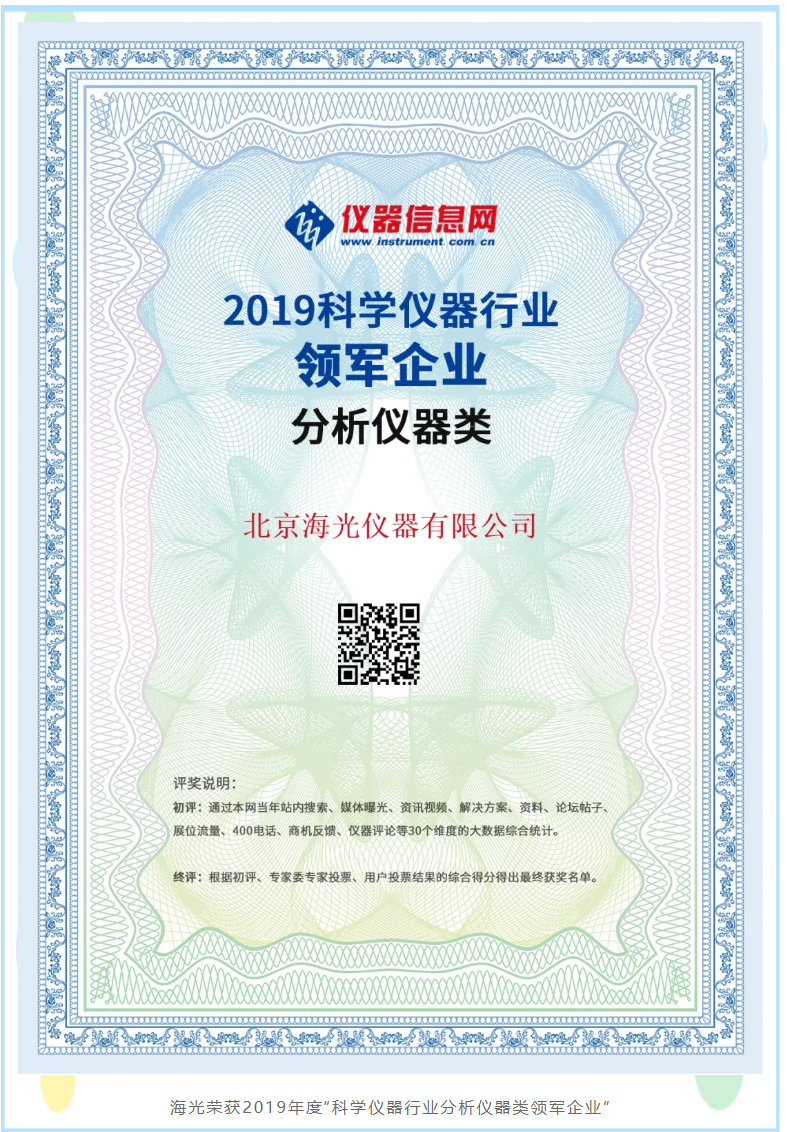 北京海光儀器有限公司是中國儀器儀表行業(yè)協(xié)會常務(wù)理事單位,主要從事分析儀器的研發(fā)、制造、銷售和售后服務(wù), 是中國知名的光譜分析儀器制造廠商,連續(xù)十二年被媒體評為“最具影響力國內(nèi)儀器廠商”稱號,公司通過了質(zhì)量管理體系、環(huán)境管理體系、職業(yè)健康安全體系三大體系認(rèn)證,公司以原子熒光光度計(jì)、原子吸收分光光度計(jì)、測汞儀、流動分析儀、快速溶劑萃取儀和等離子體發(fā)射光譜儀等分析儀器為主要產(chǎn)品,廣泛應(yīng)用于食品藥品、環(huán)境監(jiān)測、農(nóng)業(yè)、質(zhì)監(jiān)、自來水、檢驗(yàn)檢疫、地質(zhì)、第三方檢測、科研等領(lǐng)域,產(chǎn)品獲得國家科技進(jìn)步三等獎、七次BCEIA 金獎、自主創(chuàng)新金獎、國產(chǎn)好儀器等多種獎項(xiàng)。日前,2019年度“科學(xué)儀器行業(yè)領(lǐng)軍企業(yè)”(原“最具影響力廠商”)評選活動獲獎名單揭曉,北京海光儀器有限公司獲分析儀器類領(lǐng)軍企業(yè)稱號,也是連續(xù)十三年獲此殊榮。