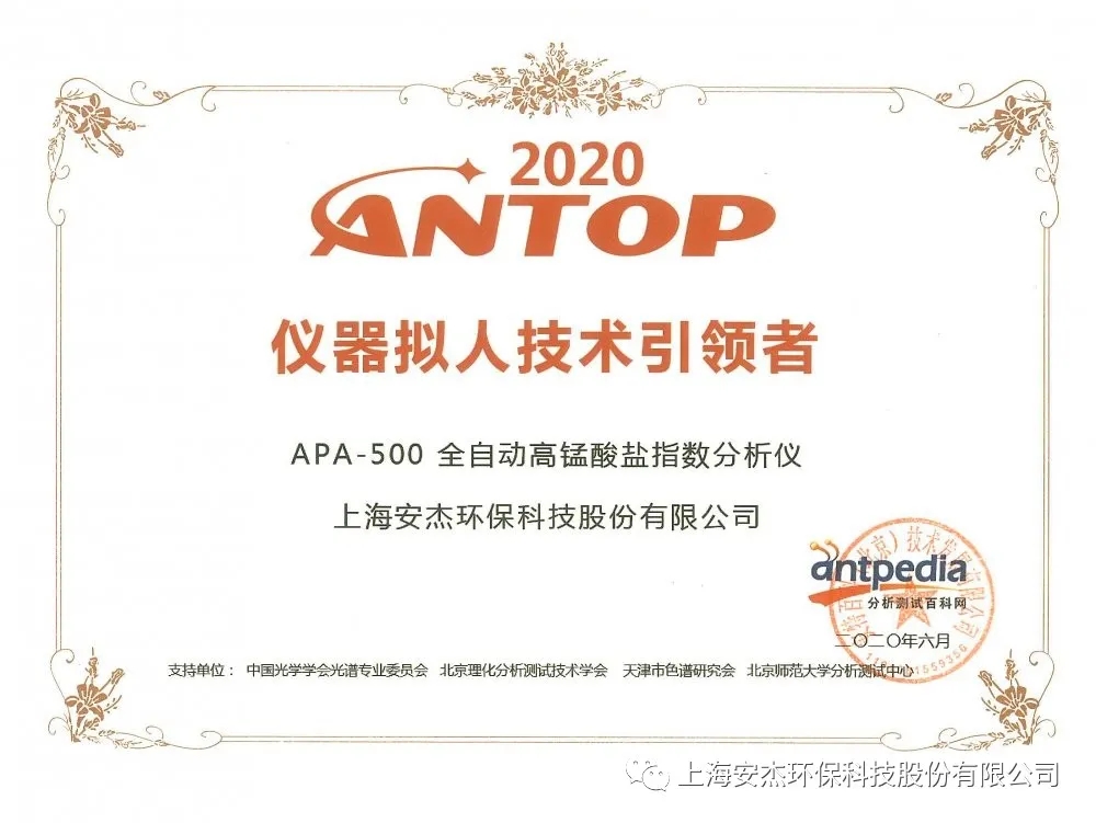 銘記是歷史前行的動力!分析測試百科網特別設立“ANTOP獎”,用以記錄最被行業人士認同、對行業產生卓越貢獻或獨特影響的人/物/事。2020年7月1日,ANTOP2020頒獎盛典于線上隆重舉行。安杰科技APA-500 全自動高錳酸鹽指數分析儀榮獲ANTOP 2020 儀器擬人技術引領者獎、最具人氣產品獎。
