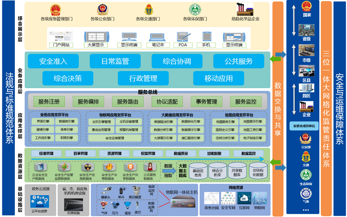 平臺(tái)總體框架自下而上分別為基礎(chǔ)設(shè)施層、數(shù)據(jù)資源層、應(yīng)用支撐層、業(yè)務(wù)應(yīng)用層和綜合展現(xiàn)層,以及兩翼的法規(guī)與標(biāo)準(zhǔn)規(guī)范體系、“三位一體”大網(wǎng)格化監(jiān)管責(zé)任體系、安全與運(yùn)維保障體系(簡(jiǎn)稱(chēng)“五層三體系”)。