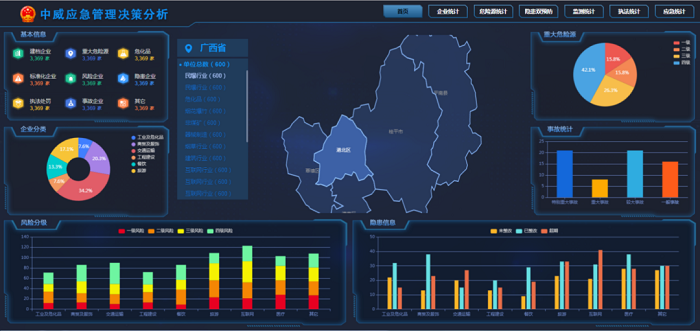輔助決策子系統(tǒng):圍繞應(yīng)急管理工作中不同專(zhuān)題進(jìn)行綜合分析,不僅能滿足日常監(jiān)管報(bào)表的自動(dòng)生成功能,同時(shí)也體現(xiàn)了如何輔助應(yīng)急管理工作更加智能化、人性化而進(jìn)行預(yù)判,為應(yīng)急管理工作掌握重點(diǎn)方向,抓住關(guān)鍵問(wèn)題。主要功能包括綜合分析、企業(yè)統(tǒng)計(jì)、危險(xiǎn)源統(tǒng)計(jì)、監(jiān)測(cè)預(yù)警統(tǒng)計(jì)、執(zhí)法統(tǒng)計(jì)和應(yīng)急統(tǒng)計(jì)。