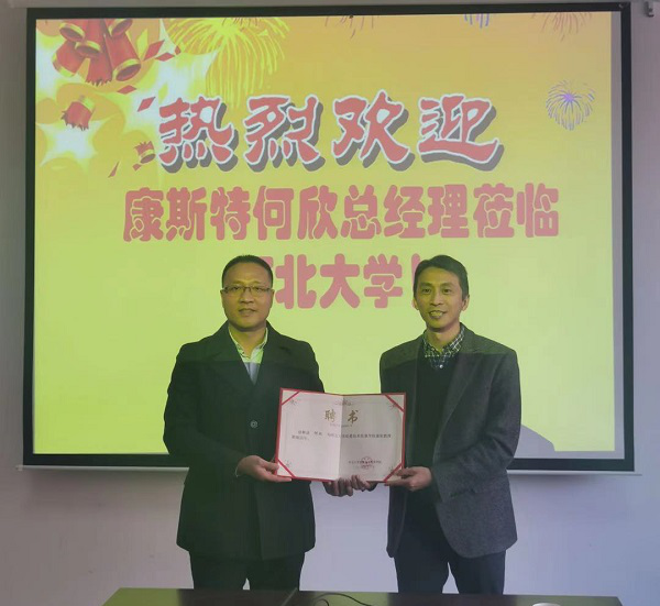 訪問期間,方立德院長代表學院向何欣總經(jīng)理頒發(fā)了兼職教授聘書。
