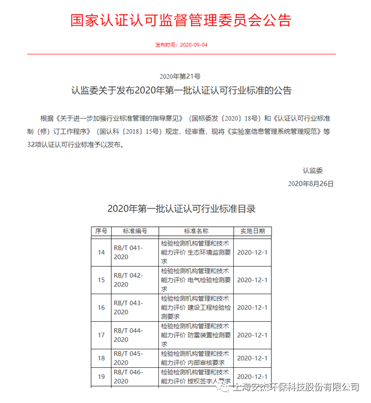 2020年9月4日,國家認證認可監督管理委員會發布《2020年第21號 認監委關于發布2020年第一批認證認可行業標準的公告》,《RB/T 041-2020 檢驗檢測機構管理和技術能力評價 生態環境監測要求》、《RB/T 042-2020 檢驗檢測機構管理和技術能力評價 電氣檢驗檢測要求》、《RB/T 043-2020 檢驗檢測機構管理和技術能力評價 建設工程檢驗檢測要求》、《RB/T 044-2020 檢驗檢測機構管理和技術能力評價 防雷裝置檢測要求》、《RB/T 045-2020 檢驗檢測機構管理和技術能力評價 內部審核要求》、《RB/T 046-2020 檢驗檢測機構管理和技術能力評價 授權簽字人要求》獲得批準發布。