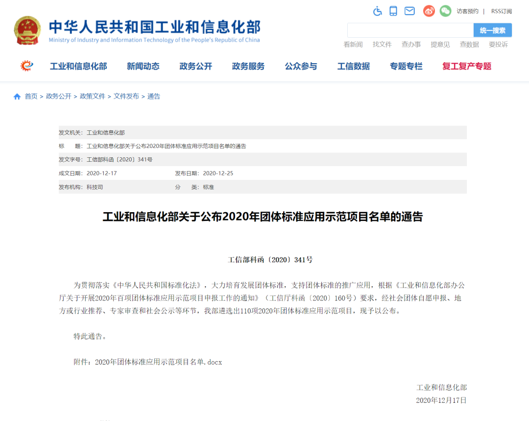 2020年團體標準應用示范項目是為貫徹落實《中華人民共和國標準化法》,大力培育發展團體標準,支持團體標準的推廣應用,根據《工業和信息化部辦公廳關于開展2020年百項團體標準應用示范項目申報工作的通知》(工信廳科函〔2020〕160號)要求,經社會團體自愿申報、地方或行業推薦、專家審查和社會公示等環節,由工業和信息化部遴選后予以公布。