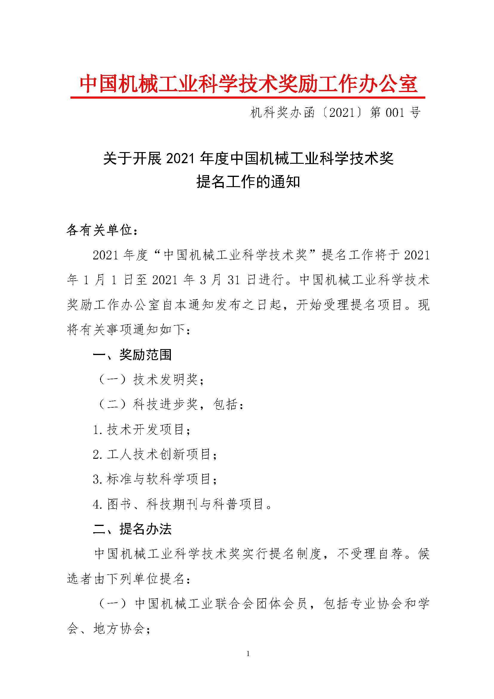 2021年度“中國(guó)機(jī)械工業(yè)科學(xué)技木獎(jiǎng)”提名工作將于2021年1月1至2021年3月31日進(jìn)行。中國(guó)機(jī)械工業(yè)科學(xué)技術(shù)獎(jiǎng)勵(lì)工作辦公室自本通知發(fā)布之日起,開(kāi)始受理提名項(xiàng)目。