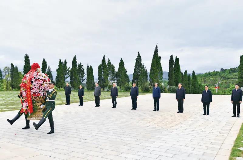 2021425日至27日,中共中央總書記、國家主席、中央軍委主席習近平在廣西考察。這是25日上午,習近平在位于桂林市全州縣的紅軍長征湘江戰役紀念園,向湘江戰役紅軍烈士敬獻花籃。