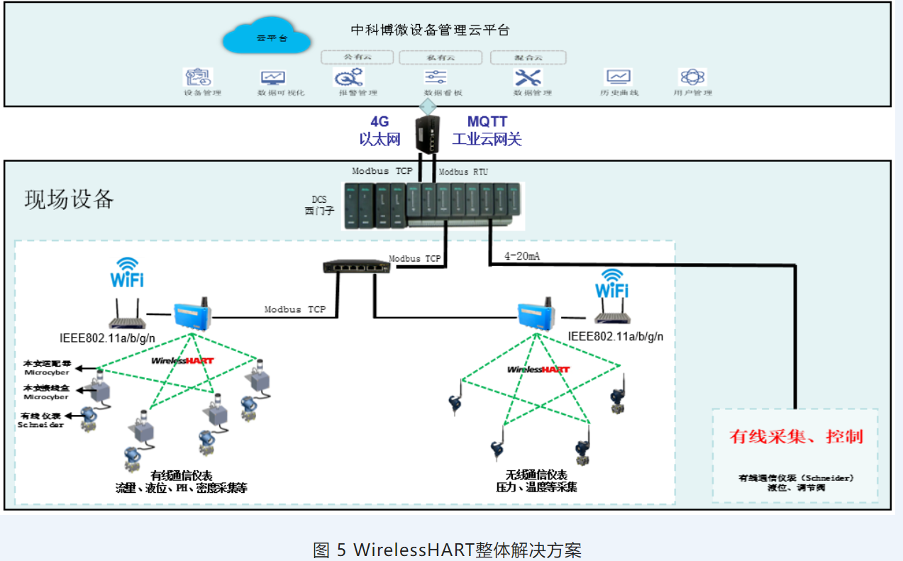 中科博微目前已經(jīng)將WirelessHART國產(chǎn)化產(chǎn)品研發(fā)逐步轉(zhuǎn)移打造適應不同工況的WirelessHART產(chǎn)品整體解決方案階段,基于WirelessHART國產(chǎn)化產(chǎn)品,打通“上游”“下游”國產(chǎn)化保障渠道,開發(fā)設備管理軟件平臺,如:NCS-View、NCS-AMS等,實現(xiàn)多協(xié)議無線網(wǎng)絡深度融合及數(shù)據(jù)互聯(lián),基于交叉融合特征的集成化創(chuàng)新、滲透輻射特征的跨領域創(chuàng)新,應對疫情環(huán)境下帶來的行業(yè)商業(yè)模式創(chuàng)新,實現(xiàn)以工業(yè)物聯(lián)網(wǎng)架構(gòu)下的行業(yè)整體解決方案,逐步完成布局,建立并形成工業(yè)物聯(lián)網(wǎng)完善的生態(tài)圈建設。如圖5所示。