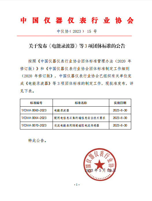 關(guān)于發(fā)布《電能錄波器》等3項(xiàng)團(tuán)體標(biāo)準(zhǔn)的公告