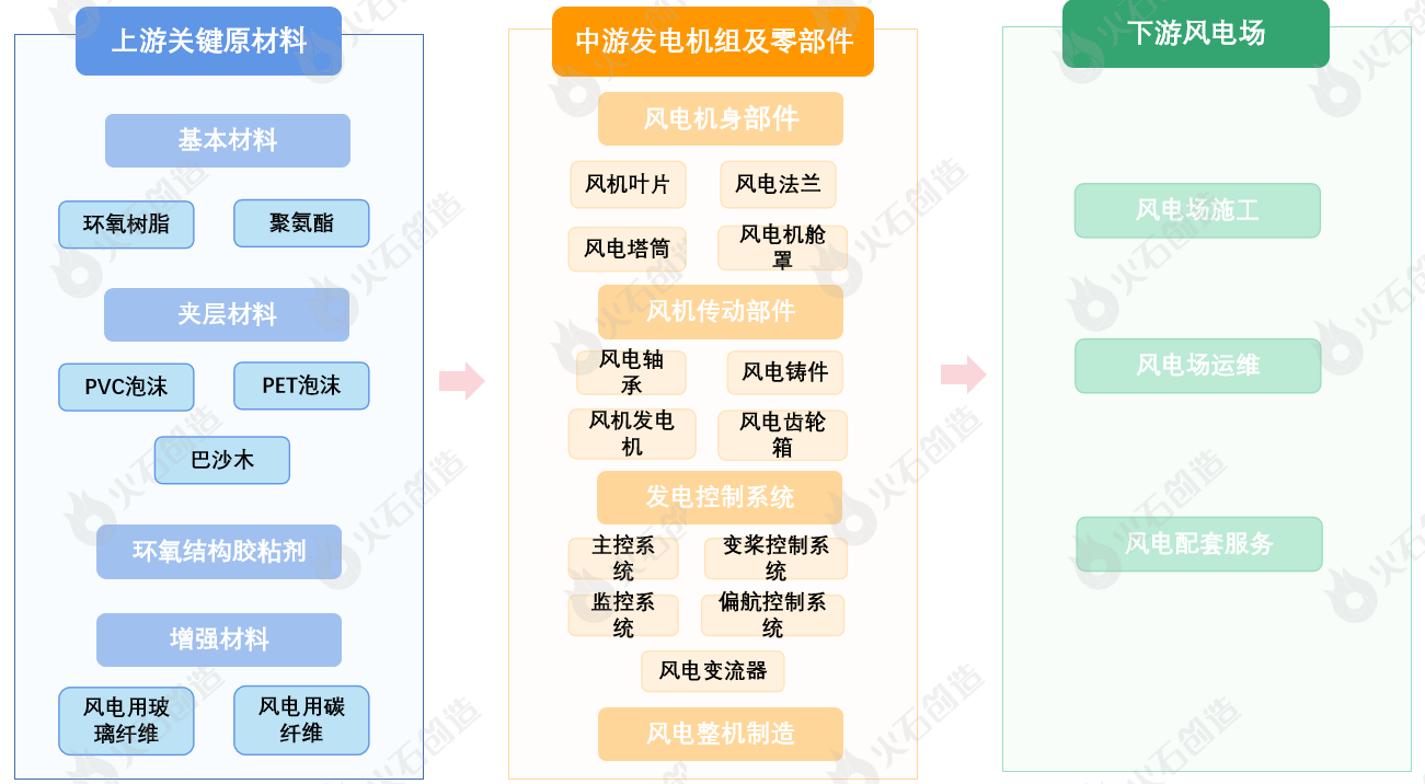 從風電產業鏈看,上游包括環氧樹脂和聚氨酯等基本材料、PVC泡沫和巴沙木等夾層材料、以及環氧結構膠粘劑、增強材料等;中游包括風電機身部件、風電傳動部件、發電控制系統和風電整機制造等;下游包括風電場施工、運維即配套服務等。