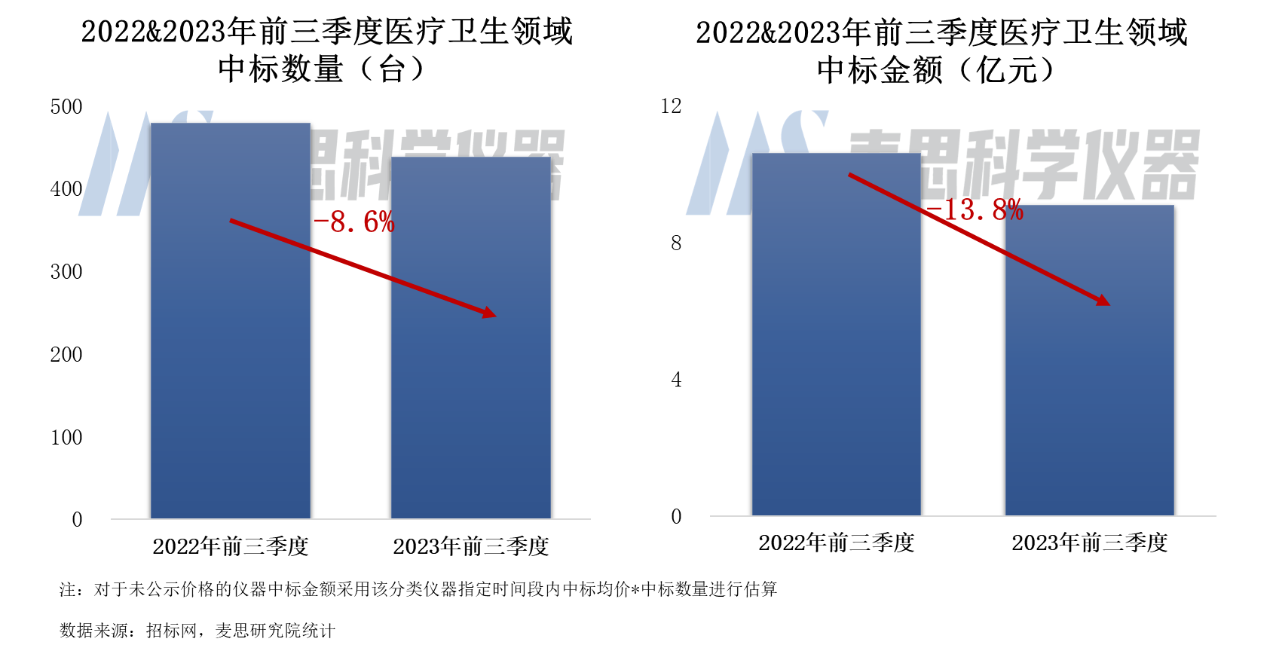 2023年前三季度質譜儀器在醫療衛生領域的中標數量達到438臺,同比下降8.6%。中標市場規模約9.1億,同比下降13.8%