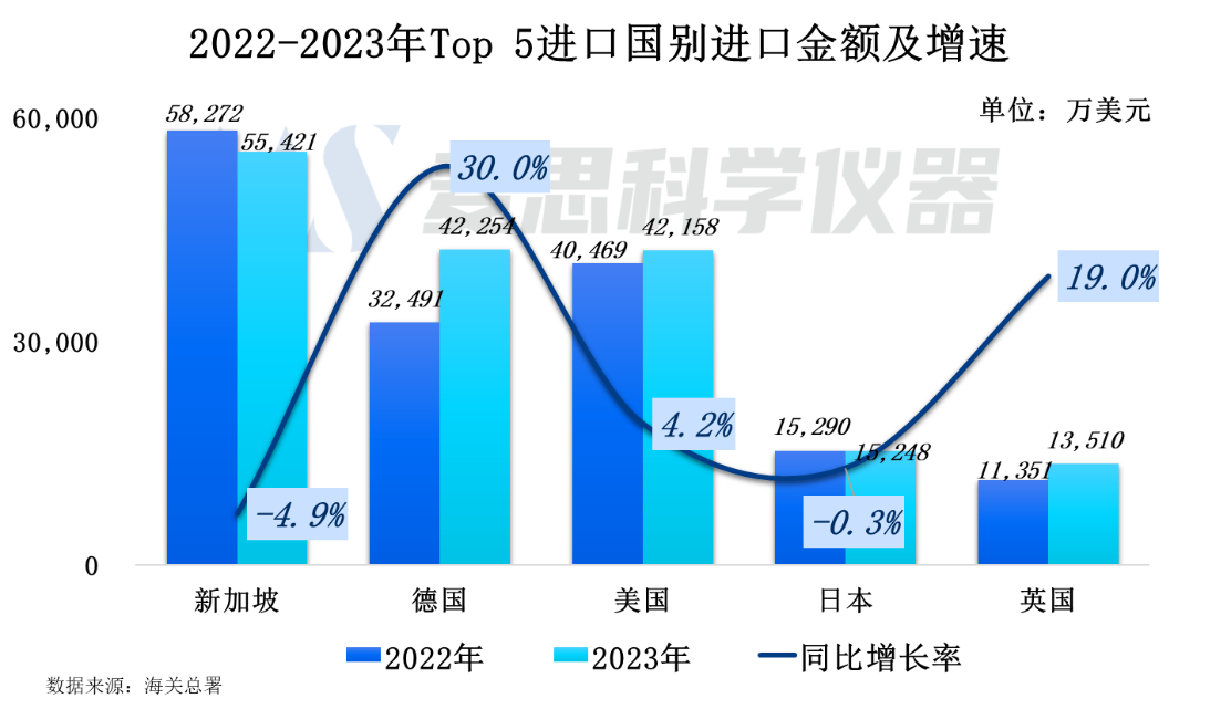 對比Top5國別2022年及2023年進口金額,從德國、美國、英國進口的質譜儀器金額呈現正增長,其中德國最為明顯,同比增速達30.0%。而新加坡和日本的進口金額則有輕微下降趨勢,同比下滑4.9%和0.3%。
