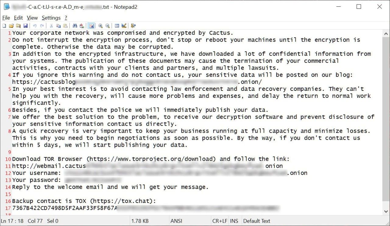 Cactus 勒索軟件行動于 2023 年 3 月啟動,與所有勒索軟件行動一樣,威脅攻擊者會通過購買憑證、與惡意軟件分銷商合作、網(wǎng)絡(luò)釣魚攻擊或利用漏洞入侵企業(yè)網(wǎng)絡(luò)。一旦進入網(wǎng)絡(luò),就會悄悄擴散到其他系統(tǒng),同時竊取服務(wù)器上的企業(yè)數(shù)據(jù)。在竊取數(shù)據(jù)并獲得網(wǎng)絡(luò)管理權(quán)限后,威脅攻擊者會加密文件并留下贖金說明。