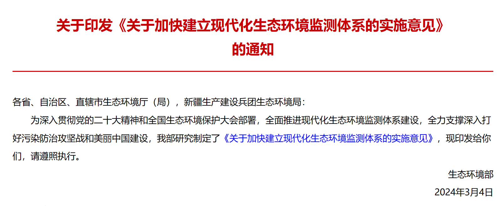 近日,生態(tài)環(huán)境部印發(fā)《關(guān)于加快建立現(xiàn)代化生態(tài)環(huán)境監(jiān)測(cè)體系的實(shí)施意見(jiàn)》(簡(jiǎn)稱《意見(jiàn)》)。這一實(shí)施意見(jiàn)旨在深入貫徹黨的二十大精神和全國(guó)生態(tài)環(huán)境保護(hù)大會(huì)部署,加快建立現(xiàn)代化生態(tài)環(huán)境監(jiān)測(cè)體系,全力支撐深入打好污染防治攻堅(jiān)戰(zhàn)和美麗中國(guó)建設(shè),以適應(yīng)生態(tài)文明建設(shè)和生態(tài)環(huán)境保護(hù)的新要求。