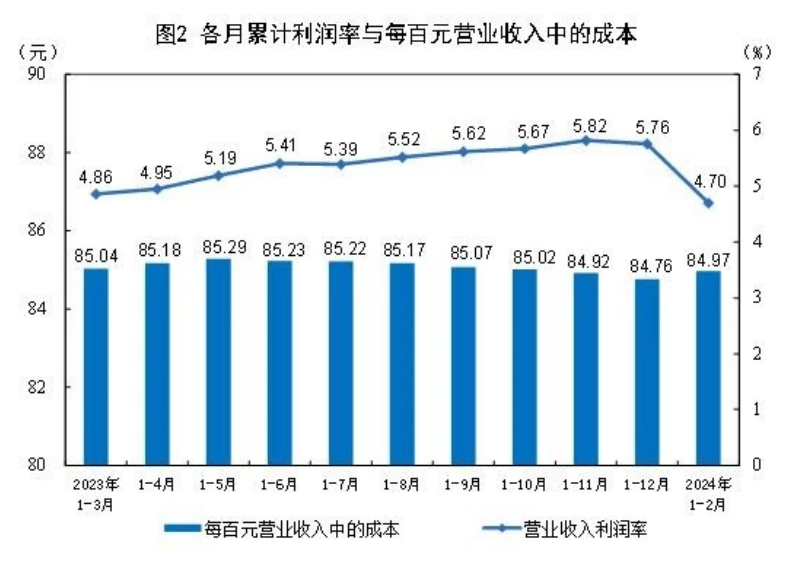 1—2月份,規(guī)模以上工業(yè)企業(yè)每百元營業(yè)收入中的成本為84.97元,同比增加0.11元;每百元營業(yè)收入中的費(fèi)用為8.62元,同比減少0.01元。
