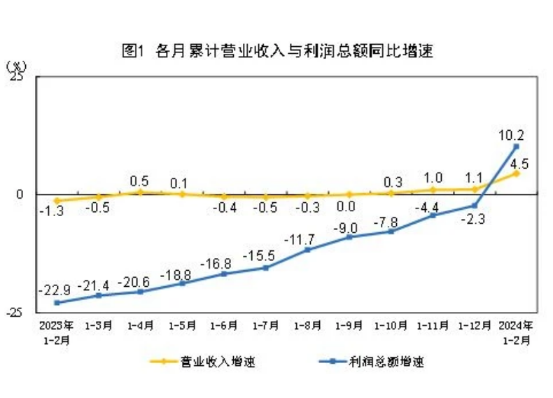 1—2月份,規(guī)模以上工業(yè)企業(yè)實(shí)現(xiàn)營業(yè)收入19.44萬億元,同比增長4.5%;發(fā)生營業(yè)成本16.52萬億元,增長4.6%;營業(yè)收入利潤率為4.70%,同比提高0.24個百分點(diǎn)。