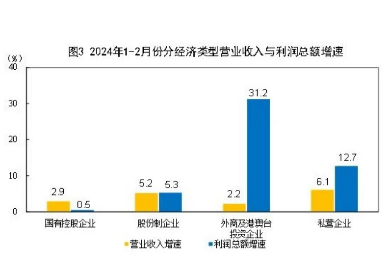 1—2月份,規(guī)模以上工業(yè)企業(yè)中,國有控股企業(yè)實(shí)現(xiàn)利潤總額3434.9億元,同比增長0.5%;股份制企業(yè)實(shí)現(xiàn)利潤總額6898.5億元,增長5.3%;外商及港澳臺投資企業(yè)實(shí)現(xiàn)利潤總額2169.2億元,增長31.2%;私營企業(yè)實(shí)現(xiàn)利潤總額2465.4億元,增長12.7%。