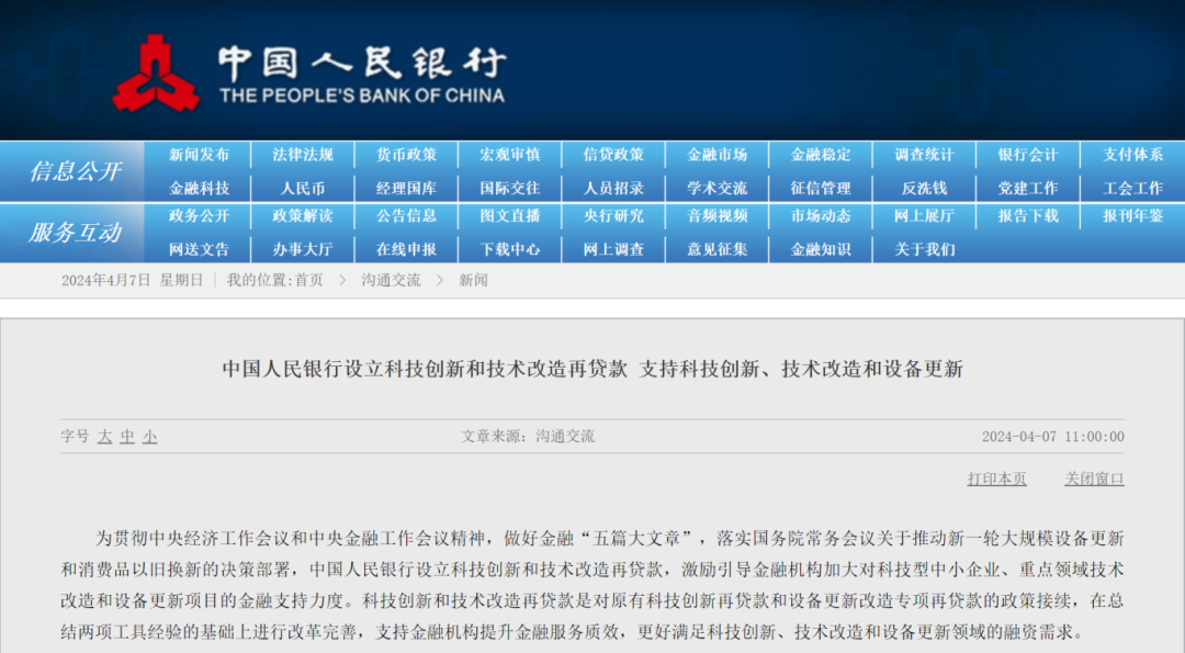 4月7日,據(jù)央行官網(wǎng)消息,為貫徹中央經(jīng)濟工作會議和中央金融工作會議精神,做好金融“五篇大文章”,落實國務院常務會議關于推動新一輪大規(guī)模設備更新和消費品以舊換新的決策部署,中國人民銀行設立科技創(chuàng)新和技術改造再貸款,激勵引導金融機構加大對科技型中小企業(yè)、重點領域技術改造和設備更新項目的金融支持力度。