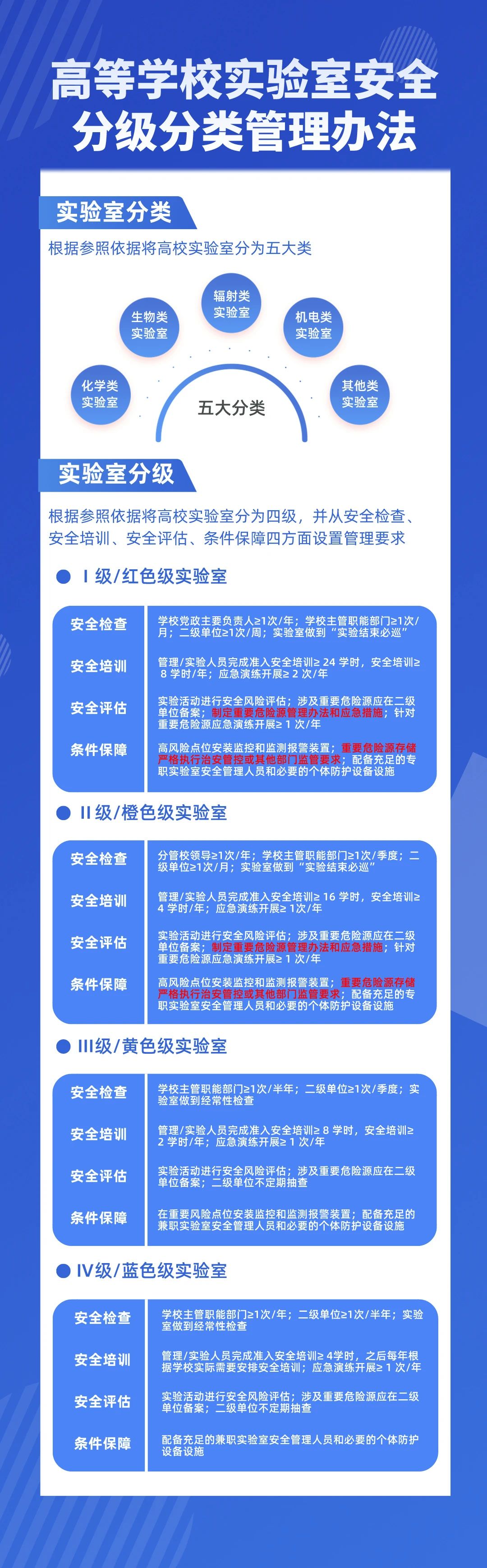 近日,教育部印發(fā)《高等學(xué)校實(shí)驗(yàn)室安全分級(jí)分類管理辦法(試行)》,對(duì)高校實(shí)驗(yàn)室安全分級(jí)分類管理的責(zé)任體系、工作原則、管理要求等作出相關(guān)規(guī)定。