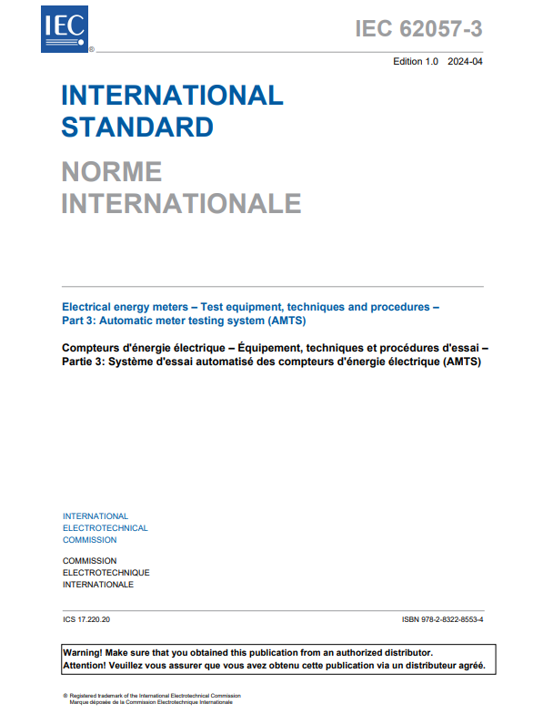 由我國主導制定的國際標準《IEC 62057-3電能表測試設備、技術和步驟 第3部分:電能表自動化試驗系統(tǒng)(AMTS)》于2024年4月23日正式由國際電工委員會(IEC)發(fā)布,這是中國首次在電能計量領域主導制定IEC國際標準。
