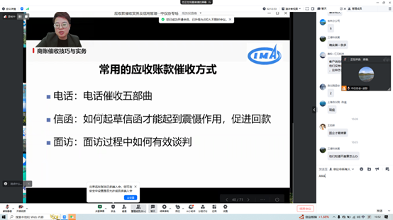 授課直播間氛圍熱烈,學(xué)員與授課老師頻頻互動(dòng)交流,咨詢?cè)跇I(yè)務(wù)開展中實(shí)際糾紛的化解策略。授課老師針對(duì)賬款催收中訴訟手段和非訴訟手段的適用場(chǎng)景進(jìn)行細(xì)致解答。學(xué)員紛紛表示,培訓(xùn)內(nèi)容切中企業(yè)痛點(diǎn),突出應(yīng)收賬款催收技巧實(shí)效性,有助于提高企業(yè)運(yùn)營(yíng)效率,降低壞賬風(fēng)險(xiǎn)。