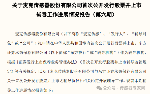2023年1月10日,麥克傳感與東方證券簽署上市輔導協議,截止2024年7月10日,麥克傳感已完成第六期上市輔導工作。