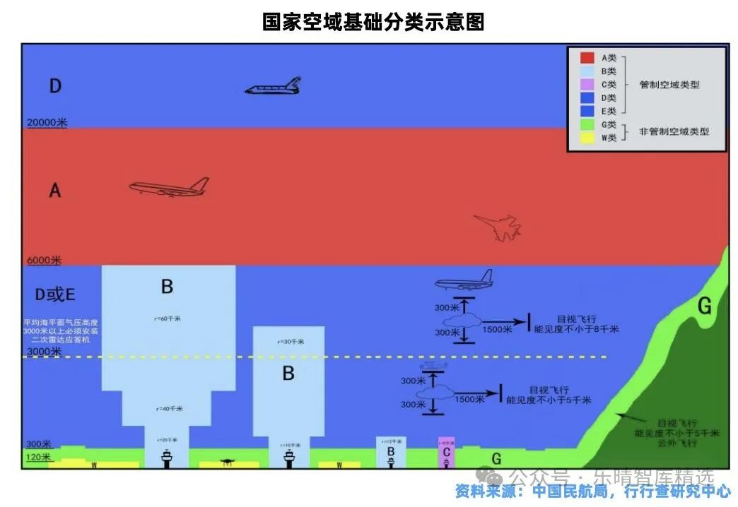 2023年12月民航局發(fā)布的《國家空域基礎(chǔ)分類方法》中,將空域劃分為A、B、C、D、E、G、W等7類,其中,A、B、C、D、E類為管制空域,G、W類為非管制空域。