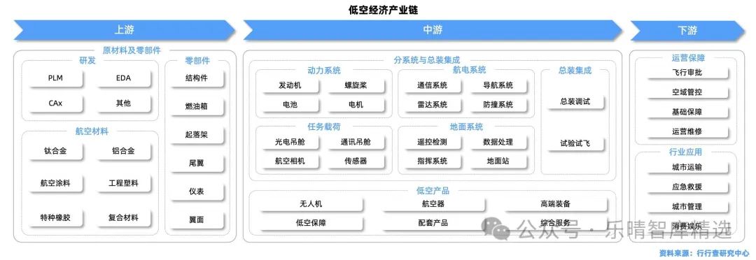 中游聚焦于分系統(tǒng)與總裝集成、低空產(chǎn)品的研發(fā)與生產(chǎn),涵蓋動力系統(tǒng)、航電系統(tǒng)、無人機、航空器等。