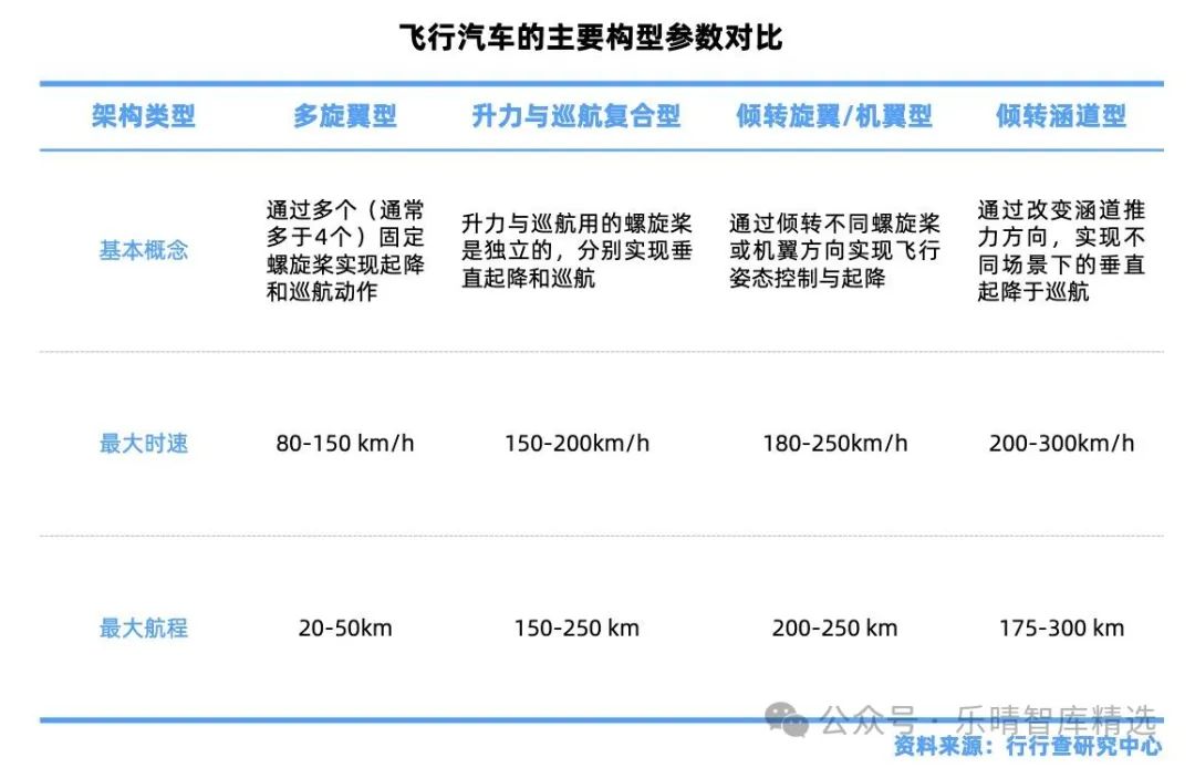 飛行汽車主要架構(gòu)包括多旋翼型、升力與巡航復(fù)合型、傾轉(zhuǎn)旋翼/機翼型、傾轉(zhuǎn)涵道型。