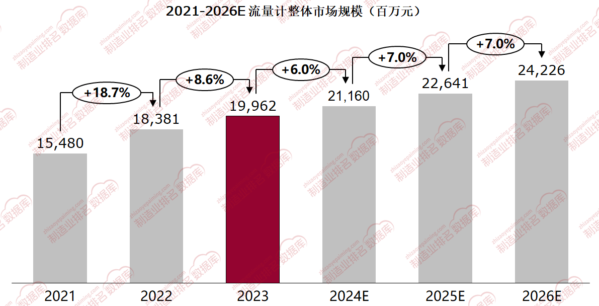 中國流量計市場在2023年的市場規模為199.62億元人民幣,顯示出中國市場的快速增長和潛力。這種增長受到多種因素的影響,包括能源需求的增長、環保意識的增強、技術創新的推動以及自動化、智能化趨勢的發展。這些因素共同作用,推動了流量計市場的需求增長。
