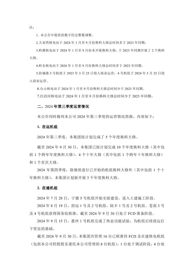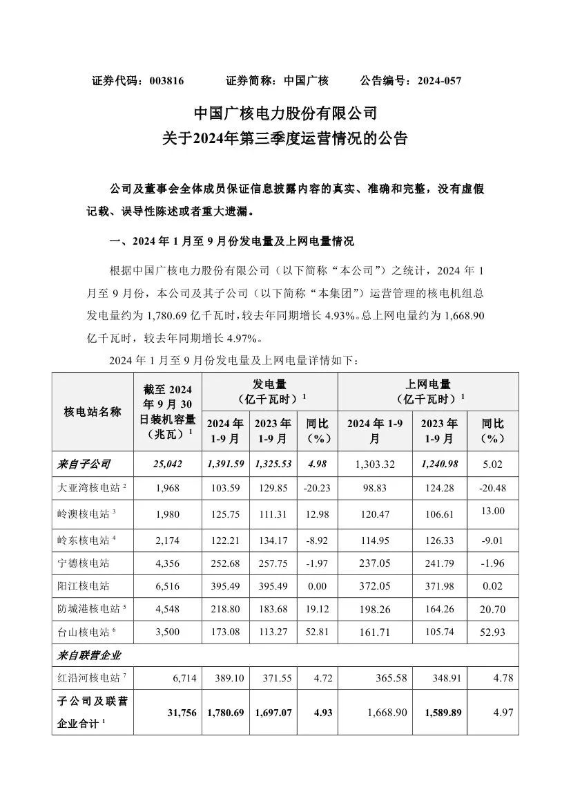 據(jù)悉,中國(guó)廣核近日披露2024年第三季度運(yùn)營(yíng)情況。