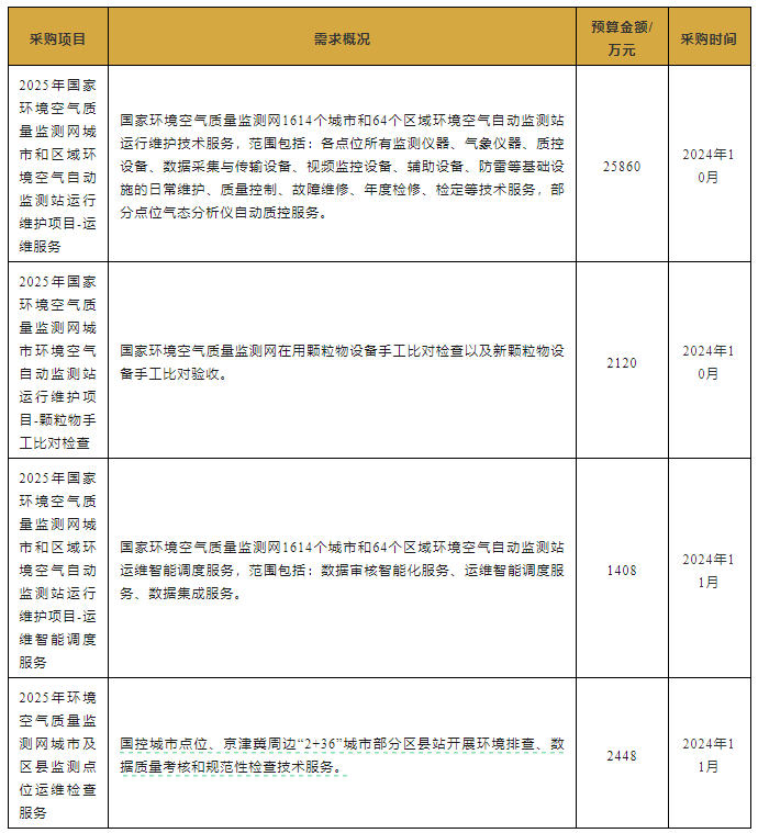 近日,中國環(huán)境監(jiān)測總站發(fā)布4項儀器設(shè)備采購意向,預算總額達3.18億元,涉及2025年國家環(huán)境空氣質(zhì)量監(jiān)測網(wǎng)城市和區(qū)域環(huán)境空氣自動監(jiān)測站運行維護項目、2025年國家環(huán)境空氣質(zhì)量監(jiān)測網(wǎng)城市環(huán)境空氣自動監(jiān)測站運行維護項目-顆粒物手工比對檢查、2025年國家環(huán)境空氣質(zhì)量監(jiān)測網(wǎng)城市和區(qū)域環(huán)境空氣自動監(jiān)測站運行維護項目-運維智能調(diào)度服務、2025年環(huán)境空氣質(zhì)量監(jiān)測網(wǎng)城市及區(qū)縣監(jiān)測點位運維檢查服務等,預計采購時間為2024年10~11月。