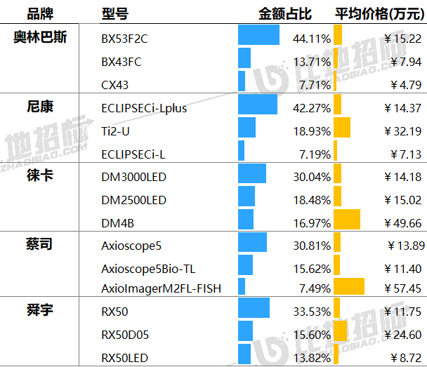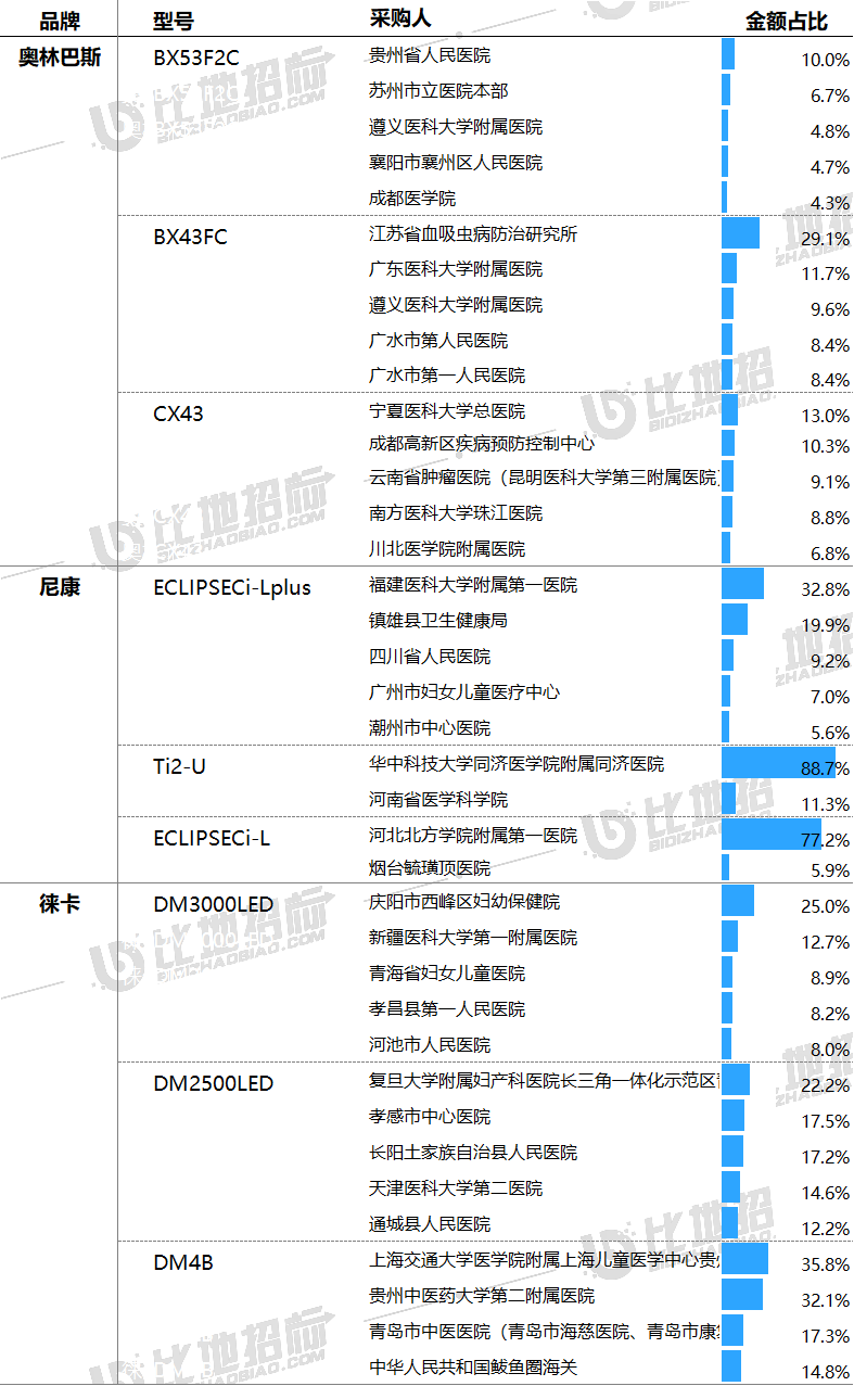 主要采購單位及對(duì)應(yīng)中標(biāo)品牌包括:貴州省人民醫(yī)院(奧林巴斯),慶陽市西峰區(qū)婦幼保健院(徠卡),福建醫(yī)科大學(xué)附屬第一醫(yī)院(尼康)等。