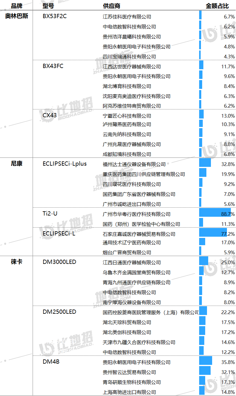 主要供應(yīng)商及對(duì)應(yīng)中標(biāo)品牌包括:江西日通醫(yī)療器械有限公司(徠卡),江蘇佳科醫(yī)療有限公司(奧林巴斯),福州達(dá)士通儀器設(shè)備有限公司(尼康)等。