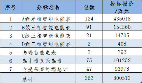 A級單相智能電能表招124包435018萬元,占總金額的54.34%;