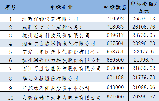 本次中標金額前五名企業(yè)為河南許繼儀表有限公司、威勝集團(含威勝信息)、杭州炬華科技股份有限公司、煙臺東方威思頓電氣有限公司、寧波三星醫(yī)療電氣股份有限公司。