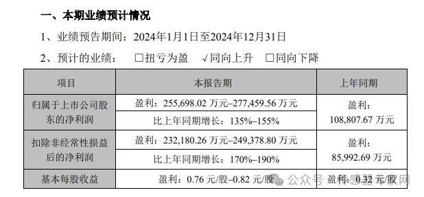 經財務部門初步測算,預計 2024 年實現歸屬于母公司所有者的凈利潤為315,529.74 萬元到 335,529.74 萬元,與上年同期相比,將增加 259,967.34 萬元到279,967.34 萬元,同比增加 467.88%到 503.88%。