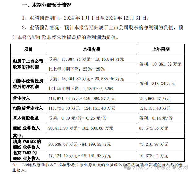 報告期內,歸屬于上市公司股東的凈利潤為-13,987.78 萬元~-19,168.44 萬元,比上年同期下降235%~285%,扣除非經常性損益后的凈利潤 為-15,404.80 萬元~-20,585.46 萬元,比上年同期下降1,989%~2,625%,營業收入116,971.44 萬元~129,968.27 萬元,MEMS 業務收入98,411.90 萬元~102,690.68 萬元,瑞典 FAB1&2 的MEMS 業務收入80,538.68 萬元~84,199.53 萬元 ,北京 FAB3 的MEMS 業務收入17,124.10 萬元~18,161.93 萬元。