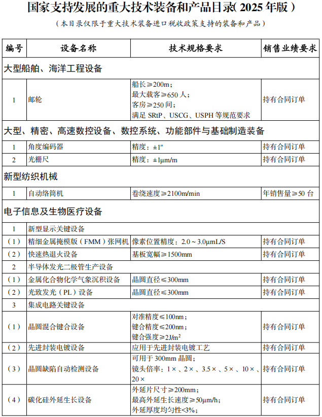 同步發(fā)布《國(guó)家支持發(fā)展的重大技術(shù)裝備和產(chǎn)品目錄(2025年版)》、《重大技術(shù)裝備和產(chǎn)品進(jìn)口關(guān)鍵零部件、原材料商品目錄(2025年版)》和《進(jìn)口不予免稅的重大技術(shù)裝備和產(chǎn)品目錄(2025年版)》,自2025年3月1日起執(zhí)行。