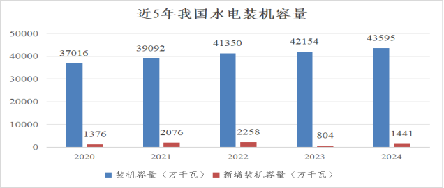 水電作為常規電力中唯一的可再生能源,2024年總體呈現出穩定增長的發展趨勢,并且在全球范圍內保持領先地位。截至當年底,我國水電總裝機容量達到4.36億千瓦,占我國電力總裝機的13.02%,較2023年新增裝機容量1378萬千瓦,同比增長3.2%,其中,常規水電裝機規模3.77億千瓦、同比增加625萬千瓦;抽水蓄能裝機規模5869萬千瓦、同比增加753萬千瓦。全年水電發電量14239億千瓦時,占發電總量的13.53%,僅次于火電,排在第2位;規模以上水電年平均利用小時數為3349小時。在雙碳目標和新能源快速發展的大背景下,水電以其穩定、清潔的特點,成為我國清潔能源供應的可靠保證。