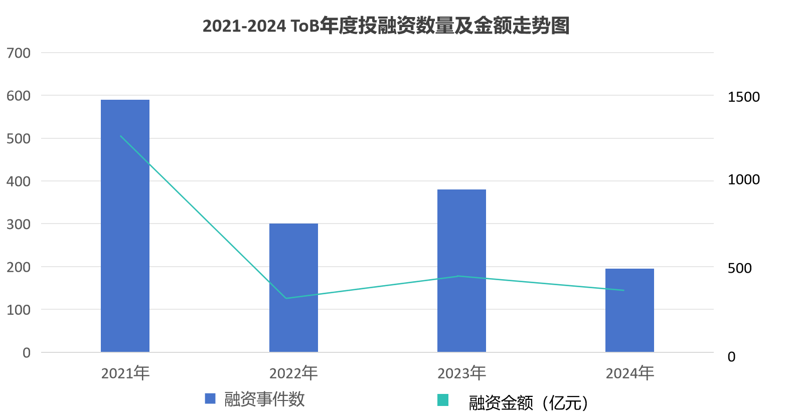 縱觀整個ToB軟件市場,技術(shù)支撐、垂直行業(yè)、工業(yè)軟件這三大類連續(xù)兩年保持為融資核心領(lǐng)域的TOP3。其中,2021年是近四年里的“融資高峰年”,隨后幾年進(jìn)入調(diào)整期,2022年間無論融資數(shù)量還是金額大幅下滑,這與宏觀經(jīng)濟環(huán)境、資本市場收緊及行業(yè)泡沫清理密切相關(guān);2023年的回升顯示行業(yè)逐步走向理性,優(yōu)質(zhì)項目開始重新受到資本青睞;2024年融資總額未見顯著復(fù)蘇,但行業(yè)資金更加聚焦于核心領(lǐng)域和頭部企業(yè)。