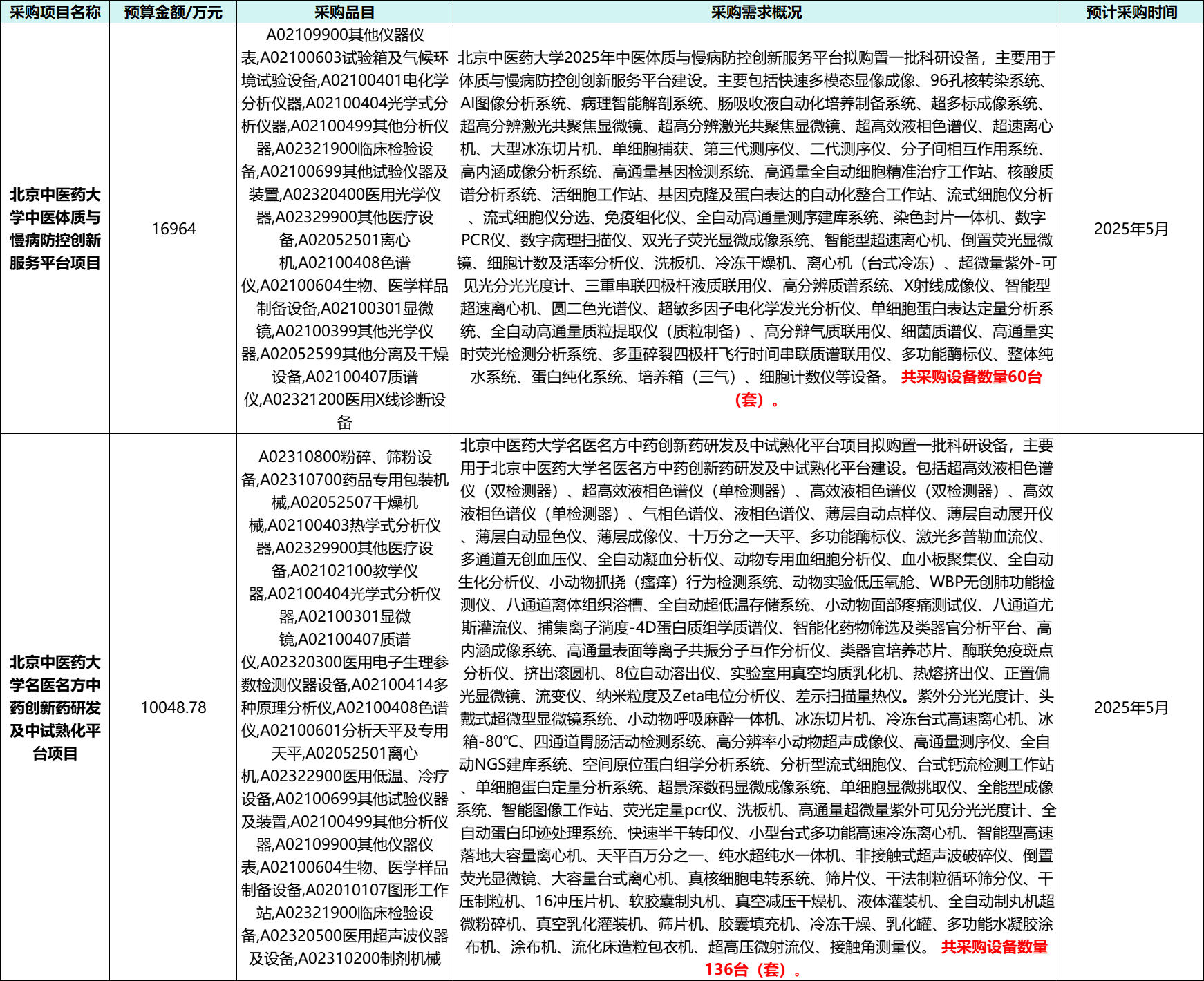 4月25日,北京中醫藥大學在中國政府采購網連續發布兩項采購意向,采購金額總計為27012.78萬元。此前,北京中醫藥大學名醫名方中藥創新藥研發及中試熟化平臺項目計劃采購的10048.78萬元項目,隨后,北京中醫藥大學再就北京中醫藥大學中醫體質與慢病防控創新服務平臺項目發布16964萬元采購項目,且計劃采購日期為5月份。仔細梳理兩個項目擬采購的儀器設備發現,本次擬采購的儀器設備除涵蓋色譜、質譜等大型分析類儀器,光學儀器、前處理儀器以及生化分析儀器等也在本次擬采購范圍之內。詳細信息如下: