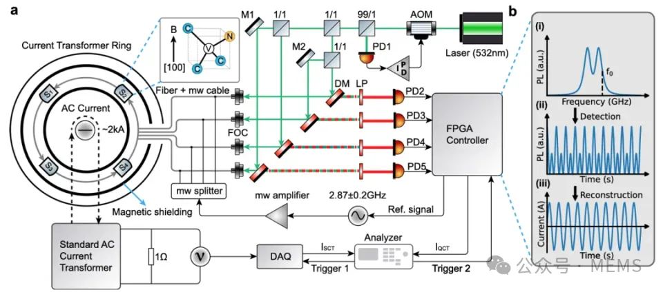 在電力系統(tǒng)中,高壓電流測量至關(guān)重要,其可靠性和準(zhǔn)確性直接關(guān)系到高壓電流模式控制、節(jié)能和電力保護(hù)。然而,隨著高壓或超高壓電網(wǎng)的大規(guī)模發(fā)展,電網(wǎng)的寬帶振蕩和諧波共振問題日益嚴(yán)重,傳統(tǒng)測量方法難以在寬電流和溫度范圍內(nèi)滿足高精度測量的要求。金剛石NV色心展現(xiàn)出諸多卓越特性,使其在磁場傳感領(lǐng)域得到廣泛應(yīng)用,特別是磁場測量可被反演至NV色心能級共振頻率測量,使得金剛石傳感器在高精度電流測量方面頗具應(yīng)用前景。但是目前金剛石量子傳感器還面臨著集成化過程中的性能下降等問題,導(dǎo)致其在實際應(yīng)用中存在諸多限制。
