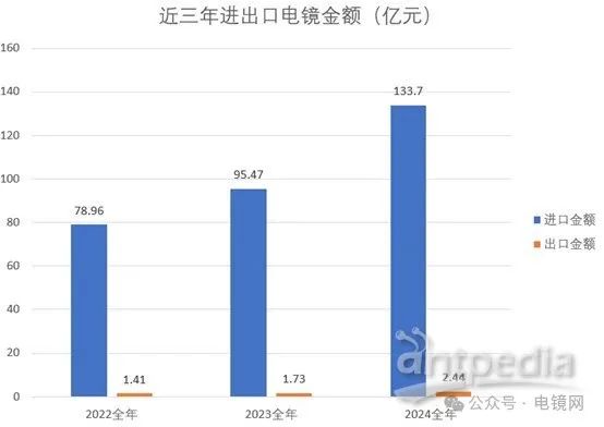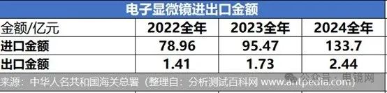 金額方面,電子顯微鏡(不含光學(xué)顯微鏡)的進(jìn)口金額從2022年的78.96億元躍升至2024年的133.7億元,復(fù)合增速高達(dá)30.2%。出口金額從1.41億元增至2.44億元,復(fù)合增長率為73 %。
