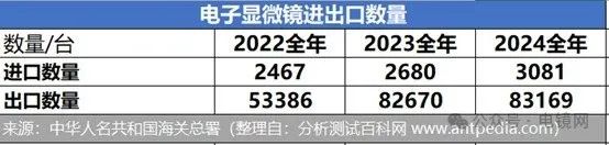 2022-2024年,電子顯微鏡(不含光學(xué)顯微鏡)進(jìn)口數(shù)量從2467臺增至3081臺,復(fù)合增長率達(dá)11.8%;出口數(shù)量從53386臺增加至83169臺,復(fù)合增長率為55.79%。