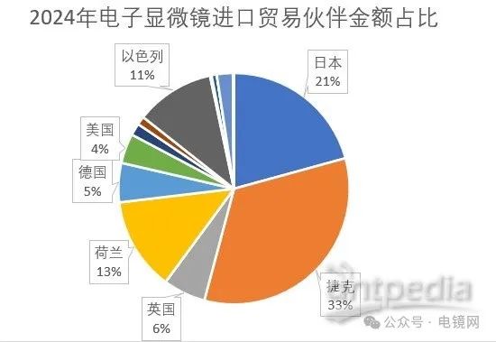 2024年電子顯微鏡進(jìn)口貿(mào)易伙伴金額中,捷克拔得頭籌,占據(jù)了33%的比例,其次是日本占21%。荷蘭和以色列分別占據(jù)13%和11%,英國和德國分別占據(jù)6%和5%,美國則占5%。